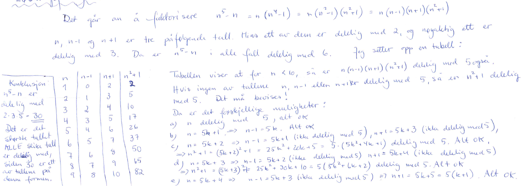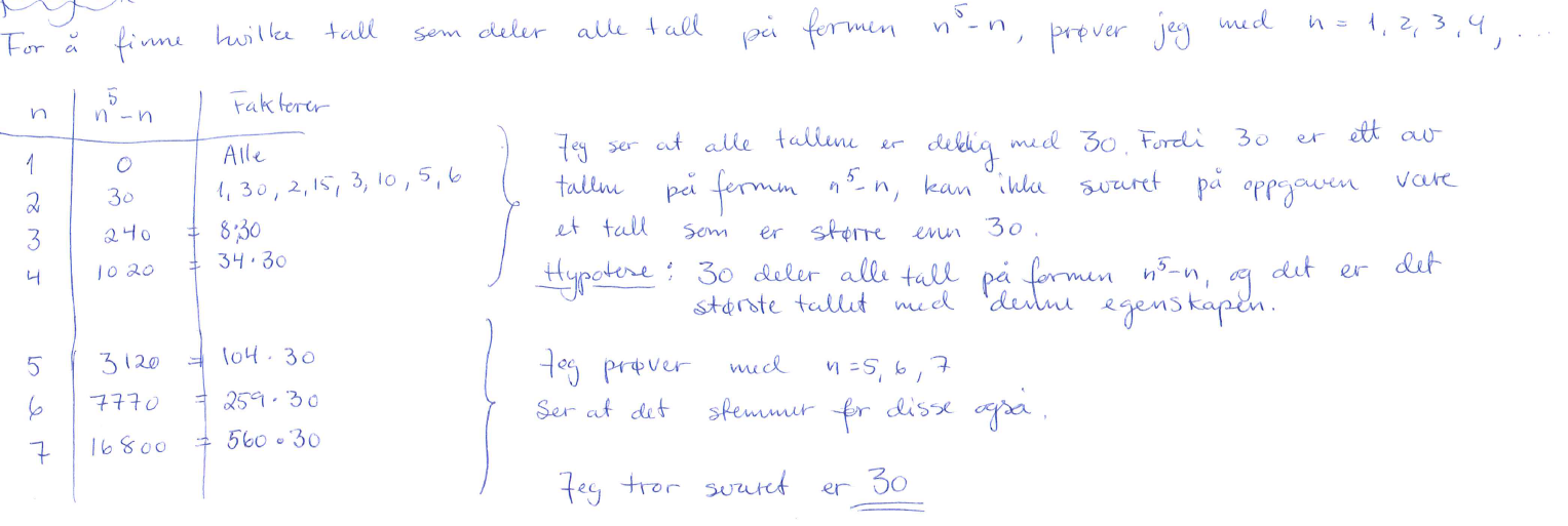 Siden 2, 3 og 5 er primtall, og alle går opp i tallene i den gitte følgen, vil 2 · 3 · 5 = 30 være faktor i alle \(n^5 - n\).