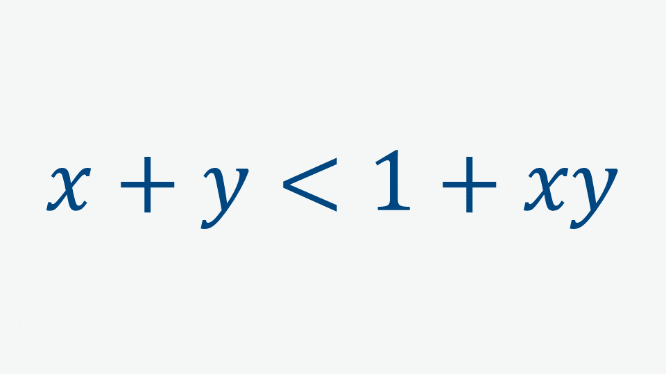 \(x + y < 1 + xy \\ \\ xy – x – y + 1 > 0 \\ x (y – 1) – (y – 1) > 0\\ (x – 1) (y – 1) > 0\\\)