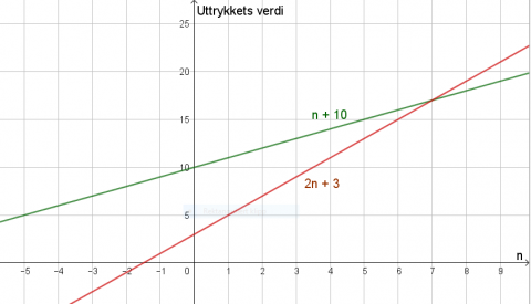 Finnes det noen måte å representere dette på grafisk, slik at vi kan bli overbevist om at det første uttrykket er størst når n < 7, og det andre er størst når n > 7?