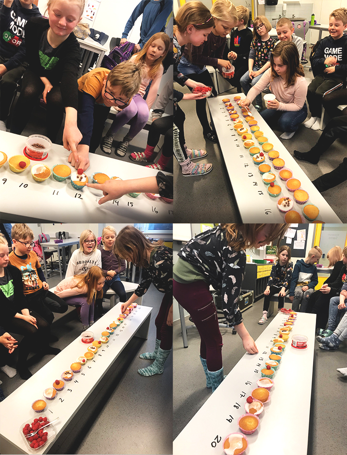 La elevene lage egne problemstillinger med et større antall kjeks og telling i forskjellige steg. Kan de finne en kombinasjon som gjør at alle kjeksene blir pyntet?
