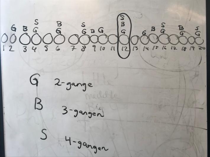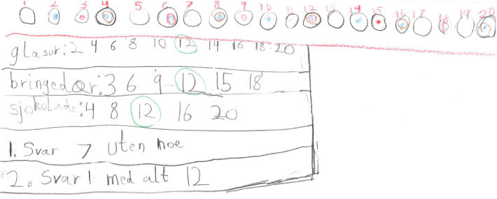 Denne aktiviteten passer til å arbeide med telling i forskjellige steg, og kan løses ved hjelp av konkreter. Den gir elevene god mulighet til å velge hvordan de skal representere oppgaven, for deretter å kunne løse den. Her er det også mulig å introdusere begrepet multiplum.