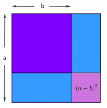 Differansen \(a^2-b^2\) er representert ved området som ikke er mørkeblått. Hvis vi lar siden i det store kvadratet være a og i det blå kvadratet være b, ser vi at differansen er \(2b(a-b)+(a-b)^2\).