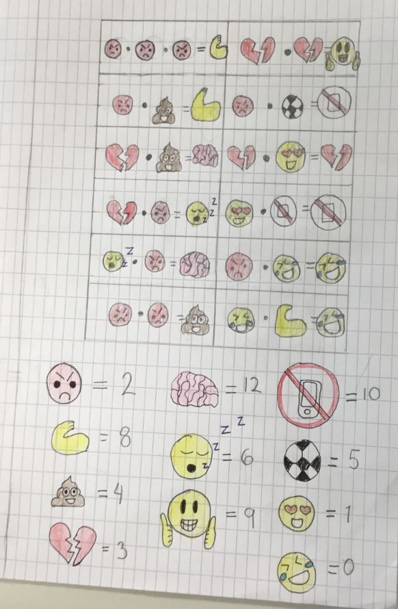 Først fant jeg ut av hvor mye de sure fjesene var, jeg fant ut at de var 2. Siden de sure fjesene var to, fant jeg ut at muskelen var 8 siden det sto sure fjes * sure fjes * sure fjes. Etterpå skulle jeg finne ut hva bæsjen var, for å finne det ut delte jeg muskelen(8) på sure fjeset(2) som ble 4(bæsjen). Etterpå bare prøvde jeg meg fram for å finne ut hva hjernen var, til slutt fant jeg ut at hjernen var 12. Da jeg fant ut hva det knuste hjertet var delte jeg hjernen(12) på bæsjen(4), da fant jeg ut at det knuste hjertet var 3. Da jeg ganget knust hjerte(3) med sure fjeset(2) fant jeg ut at det søvnige fjeset var 6. Jeg fant ut hva det smilende fjeset var da jeg ganget knust hjerte(3) med knust hjerte(3), da ble det 9(smilende fjes). Jeg fant ut at emojien med hjerteøyne var en fordi hvis knust hjerte gange med hjerteøyne skal bli knust hjerte, kan det bare være null. Jeg fant ut at det leende fjeset var null fordi, når du skulle gange surt fjeset med det leende fjeset skulle bli det leende fjeset kunne det bare være null. De siste figurene fant jeg ut med å prøve meg frem, jeg startet med fotballen og fant ut at den var 5, og fant deretter ut at mobilen med et kryss over var 10.