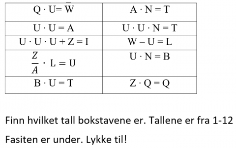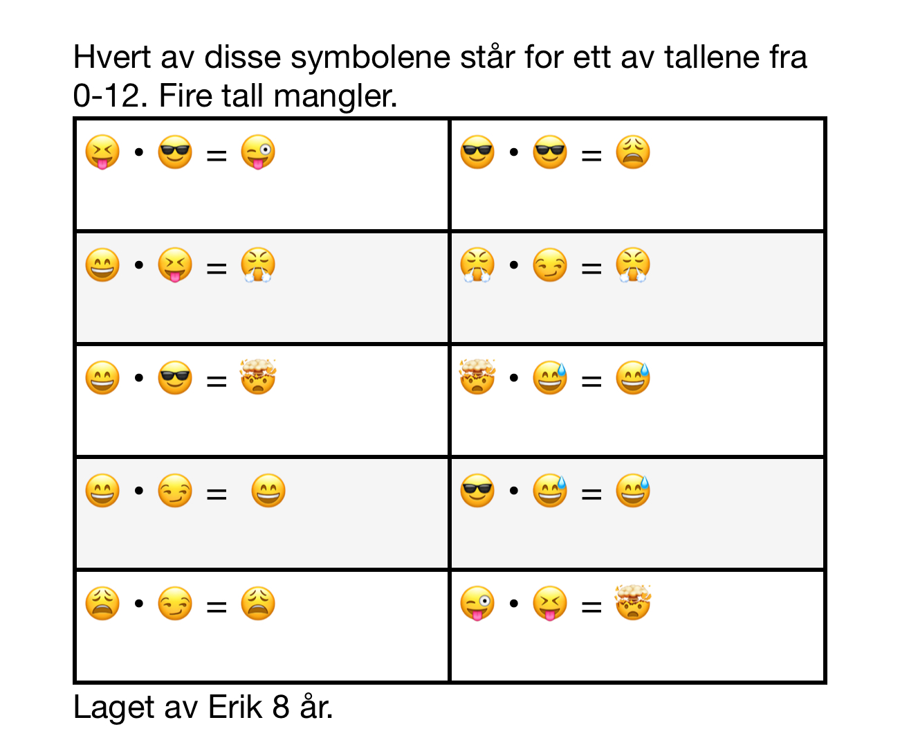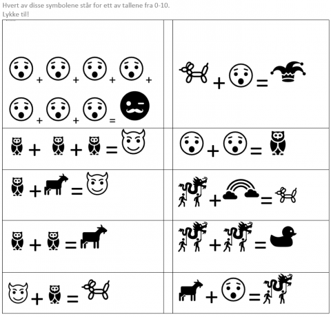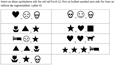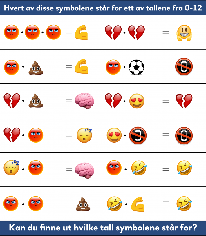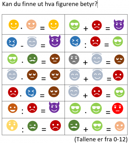 Vi fant ut at var 0 fordi 0 er den eneste som altid blir det samme uansett hva du ganger med. Suresmilefjes må være 2 for at oppgaven skal gå opp. Muskel er 8 fordi 2 ganger 2 ganger 2 er 8. Så da må bæsjen være 4 fordi 2 surefjes er en bæsj. Knust hjerte må være 3 pga bæsj er 4 og hjernen blir da 12. Sovesmily er 6 fordi hjernen er 12 og smilefjes er 2. Hjertefjes er 1 fordi alt du ganger med 1 blir det tallet du ganger med.