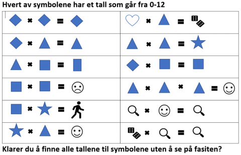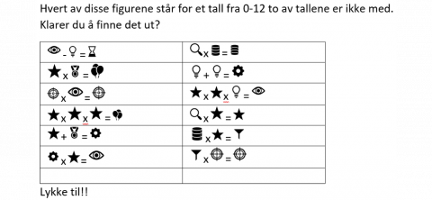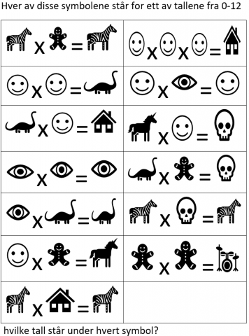 Denne oppgaven kan hjelpe elever med å bli kjent med ideen om at et symbol (i dette tilfellet figurer) kan representere et tall. Den gir også elevene mulighet til å øve på multiplikasjon og divisjon i en utfordrende kontekst.