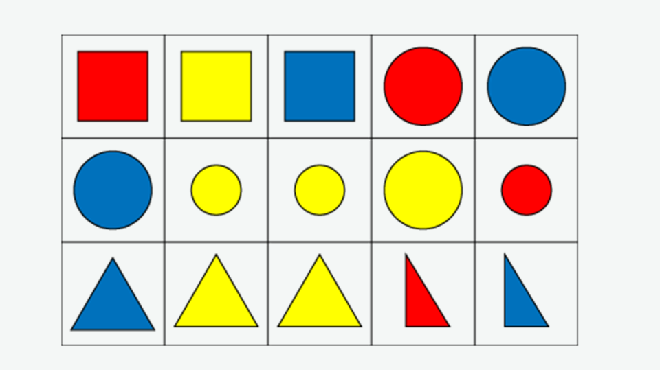 - Du kan få en oversikt over problemet ved å sortere figurene i tre bunker etter farge, og deretter sortere dem etter hvilken form de har.