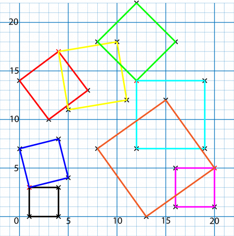 Avslutningsvis vil det være hensiktsmessig å samle koordinater og diskutere orienteringen til kvadratene, og om de faktisk har alle egenskapene som kreves av et kvadrat.