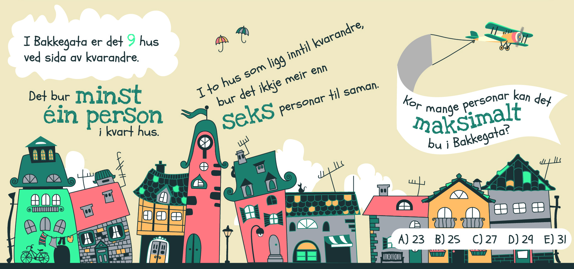 Hvis det bor 5 personer i det første huset, 1 person i det andre. 5 i det tredje, 1 i det neste osv., vil det til sammen bo 5+1+5+1+5+1+5+1+5=29 personer i de ni husene i Bakkegata.