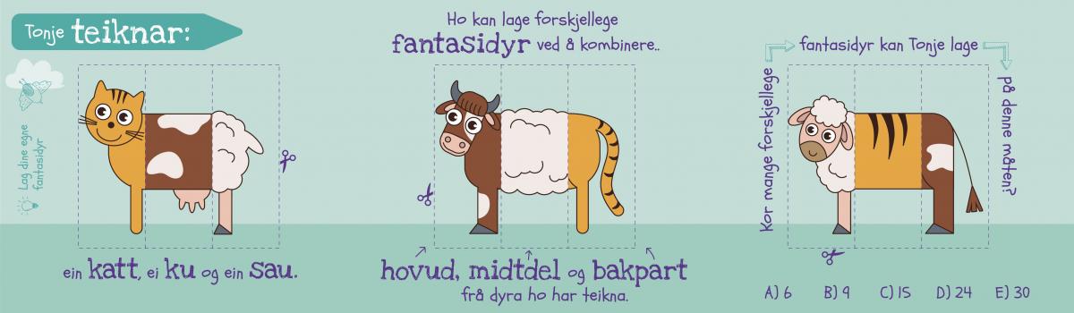 Hvert hode, det vil si sau, ku, katt kan kombineres på 6 forskjellige måter. Når det er tre dyr, blir det til sammen 24 forskjellige fantasidyr.