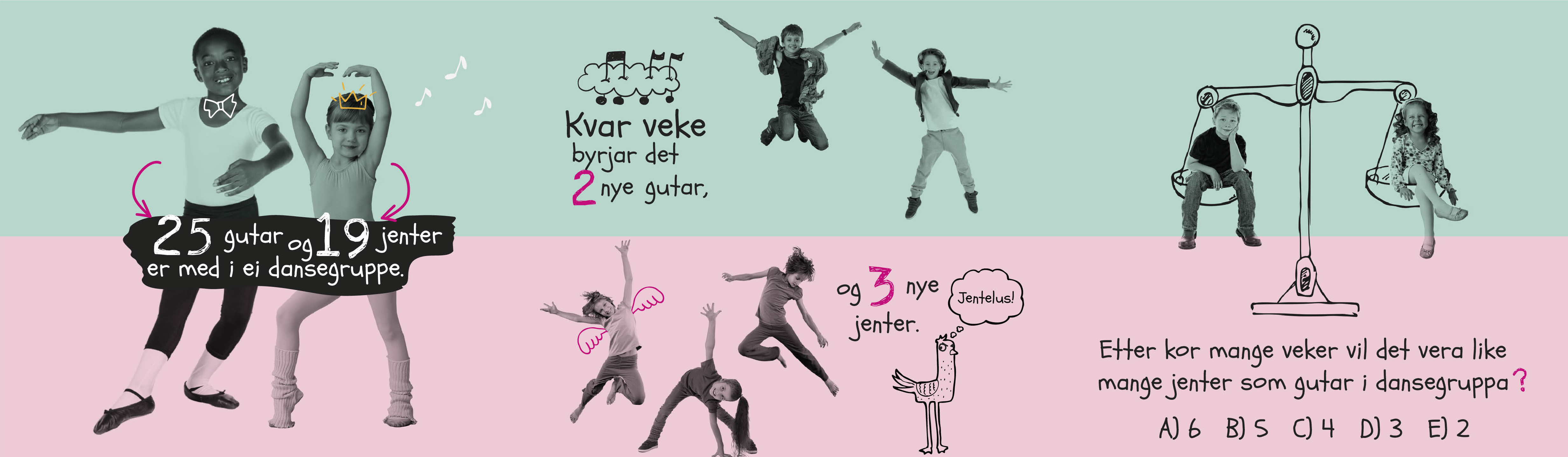 - Hva hvis det var motsatt, at det var 3 nye gutter og 2 nye jenter som begynte hver uke i denne dansegruppa? Hvis det hadde fortsatt slik, ville det noen gang bli like mange gutter som jenter i dansegruppa? Hvorfor/hvorfor ikke?