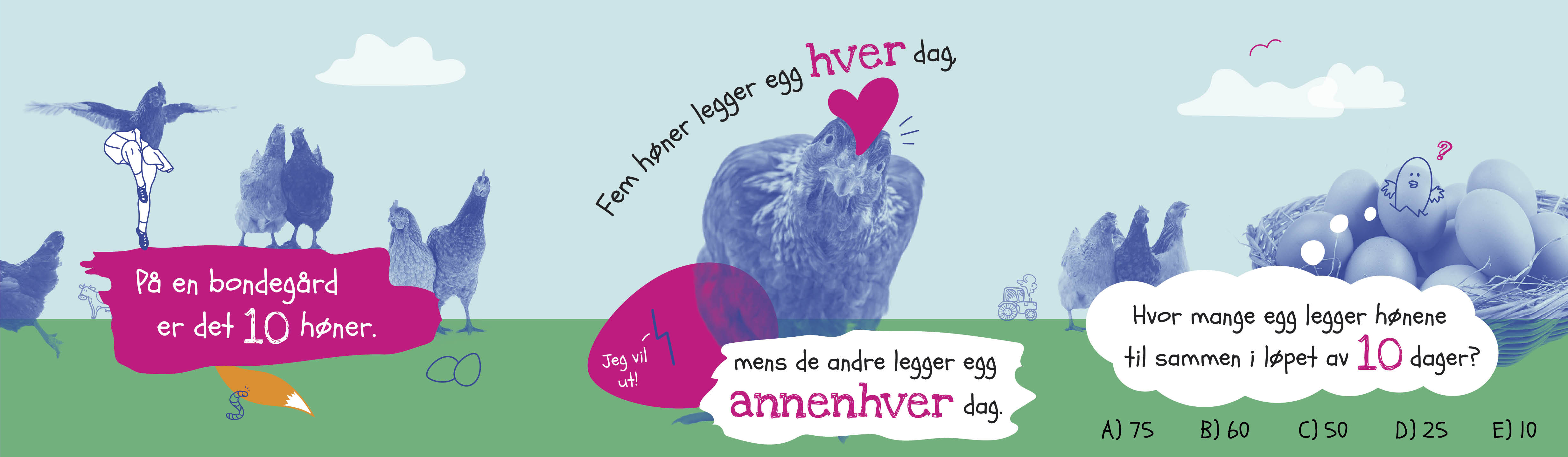Denne aktiviteten kan introduseres ved at bildet vises for alle elevene. Elevenes nysgjerrighet kan vekkes ved at læreren sier noe om at dette var en spennende utfordring! Legger virkelig høner egg hver dag? Hvor mange høner måtte vi hatt i klassen vår for at alle skulle fått ett egg hver dag på skolen?