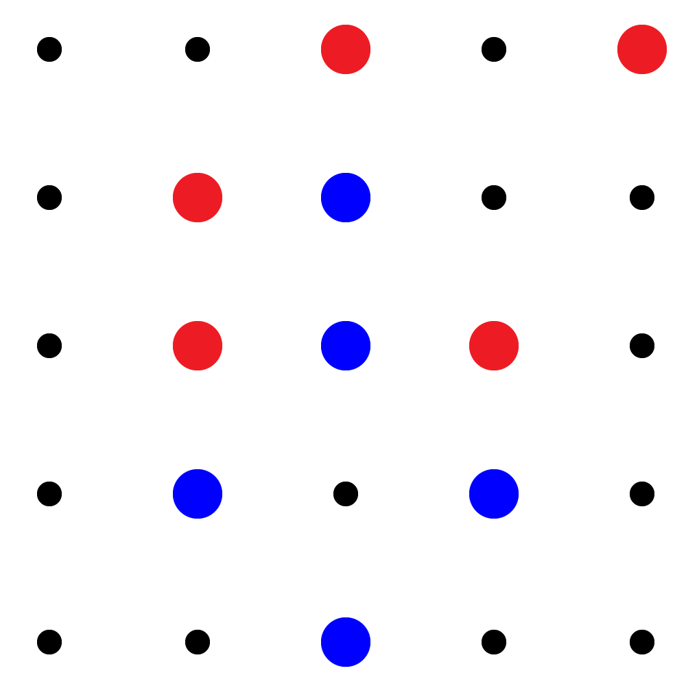 Deretter kan du henvende deg til hele klassen og forklare at du vil hente fram bildet som viser situasjonen etter at blå har gjort sitt trekk. Ikke si noe mer før du har vist bildet (du må kanskje gjøre enkelte elever oppmerksom på hvilken prikk blå har valgt):