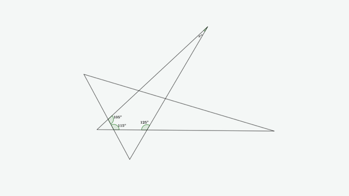 Derfor får vi: \(x=360^\circ-(105^\circ+115^\circ+125^\circ)=15^\circ\)