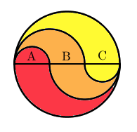 På figuren står bokstavene A, B og C for henholdsvis det røde, det oransje og det gule arealet som ligger på oversiden av diameteren.