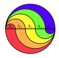 Vis algebraisk at alle områdene har like stort areal for en sirkel som er delt opp i n fargede områder (se under Løsning).