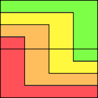 Overraskende nok har alle de fargede områdene like stort areal. Så snart elevene har regnet ut arealene i figuren med tre farger, kan de arbeide videre med figurene med fire og fem farger.