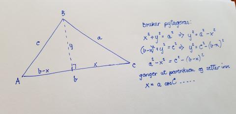 \(x^2+y^2=a^2 \: \implies \: y^2=a^2-x^2\\ (b-x)^2+y^2=c^2 \: \implies \: y^2=c^2-(b-x)^2\\ a^2-x^2=c^2-(b-x)^2\\ c^2=a^2-x^2+(b-x)^2\\ c^2=a^2-x^2+b^2-2bx+x^2\\ c^2=a^2+b^2-2bx\\ \text{setter inn } x=a\cdot cosC\\ c^2=a^2+b^2-2ab\:cosC \)