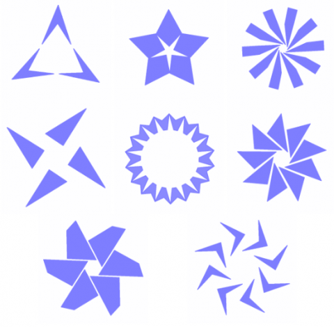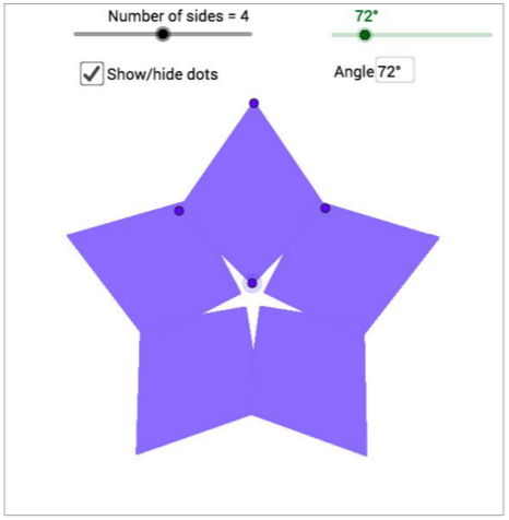 For å lage denne figuren tegnet Karl først en drage, så valgte han en rotasjon på 144˚. Alise brukte en vinkel på 216˚ og fikk nøyaktig samme figur! Hvilke andre vinkler kunne de ha brukt? Finnes det flere mønster som kan tegnes med mer enn én vinkel? |