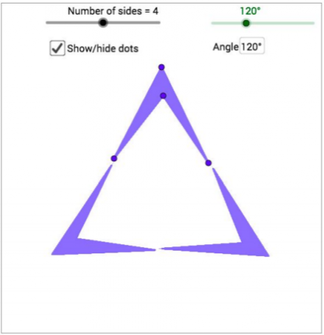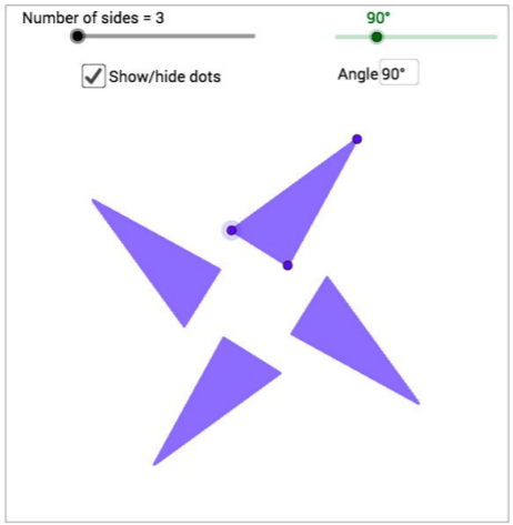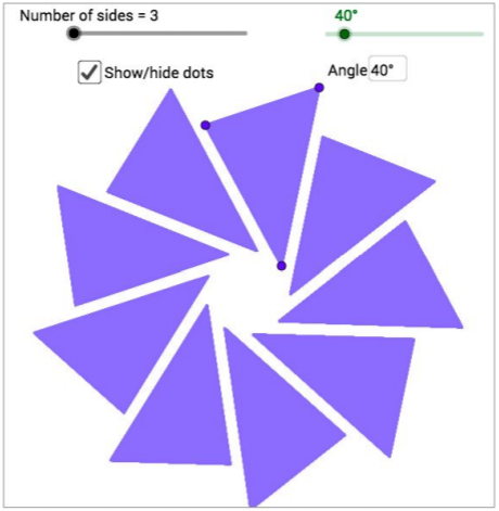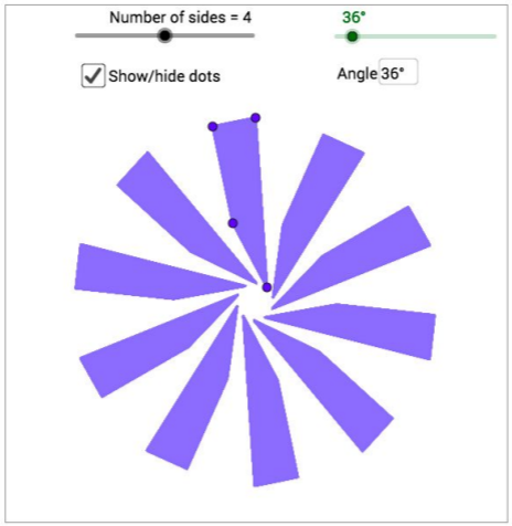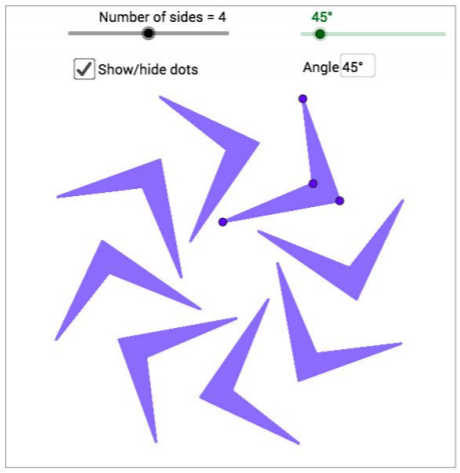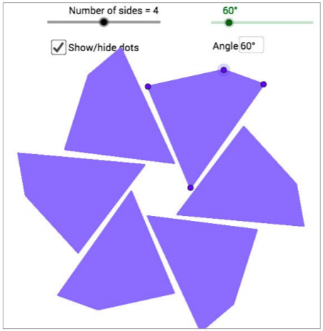 Du kan flytte på de blå punktene for å forandre formen på figurene, og du kan velge rotasjonsvinkel med glideren oppe til høyre. Figurene roteres om et punkt i midten av mønsteret. Hvis du for eksempel velger en rotasjonsvinkel på 60˚, vil figuren du har tegnet, bli kopiert for hver gang rotasjonen har beveget seg 60˚ i rotasjonsretningen. Merk deg at rotasjonsbevegelsen går svært mange runder, den stopper ikke ved 360˚.