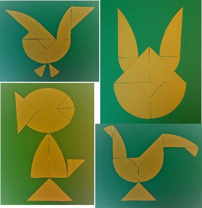 Etter at barna har laget påskeegg og lekt med brikkene en stund, kan du vise dem bilder av påskefuglene. Her bruker barna de samme brikkene som i påskeegget, men må sette dem sammen på andre måter.