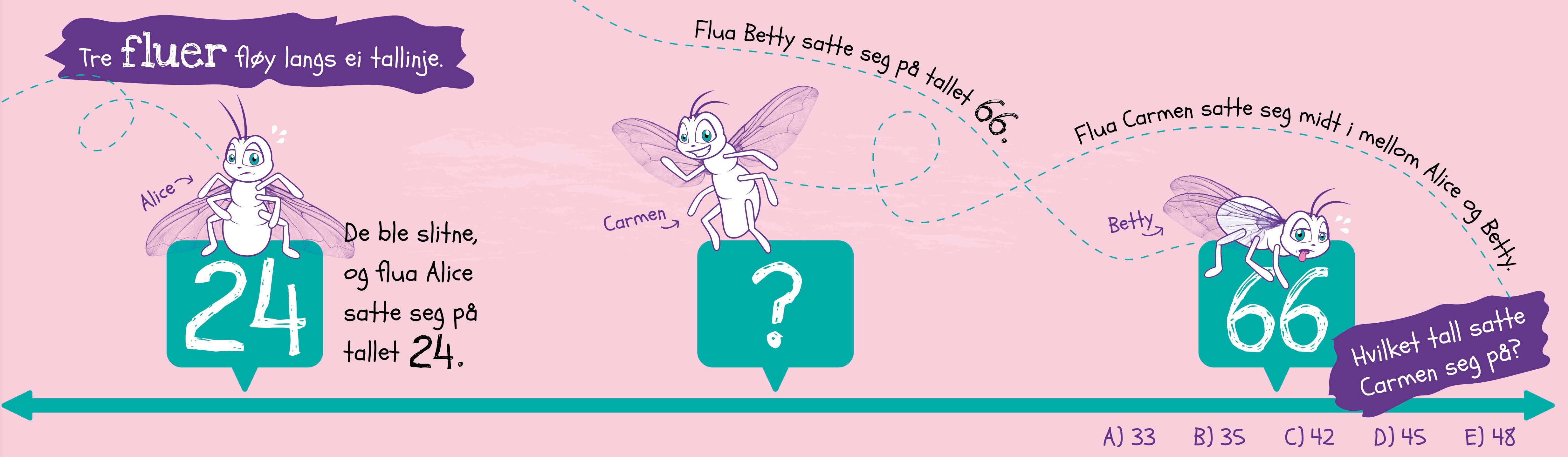 Fluene Alice, Betty og Carmen satt og ventet på at Dorris og Elvis skulle komme til tallinja. Plutselig passerte Dorris Alice i racerfart og spratt ned på tallinja 12 plasser etter Alice, før hun nådde Carmen. Men Dorris klarte ikke å stoppe, hun spratt videre med 2 like store hopp og stanset først på tallet rett før Carmen. Hvilket tall endte Dorris på? Kan du finne ut hvor lange de to hoppene/sprettene hennes var?