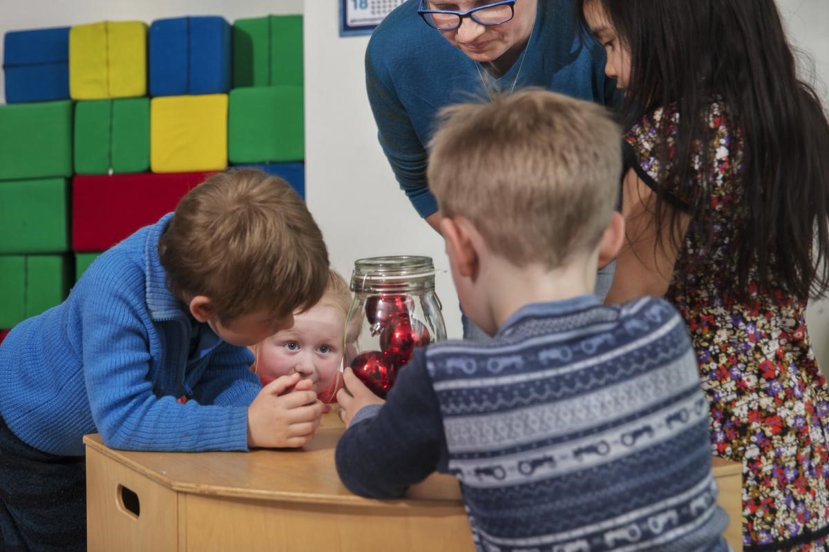 Fyll ei glasskrukke eller en annen gjennomsiktig beholder med objekter av samme type og størrelse, f.eks. julekuler. Den kan for eksempel stå på ei hylle eller på et bord der barna leker, eller den kan presenteres for barna i en samlingsstund. Krukka med objekter gir mulighet til å undre seg sammen om mengder.