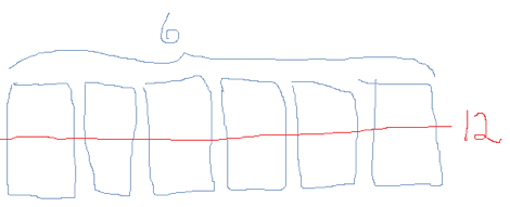 - Man kan lage en tegning av seks meter stoff (som på bildet under), dele alle i to og få tolv biter på \(1\over 2\) meter.
