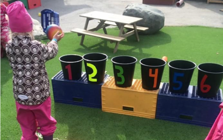 Ved å plassere bøttene i rekkefølge kan barna i tillegg få erfaringer med tallenes plassering i tallrekka: den første, den andre, den tredje, osv. Den samme opplevelsen av rekkefølge kan barna få når de selv står i kø for å vente på tur til å kaste.