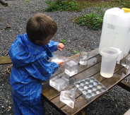 Barn liker ofte å leke med vann og å helle, fylle og tømme beholdere. Du kan lage en vannstasjon der barna har tilgang til en kanne med vann og beholdere med ulik form og størrelse. Litt konditorfarge i vannet kan gjøre det lettere for barna å se mengden av vann i beholderne.