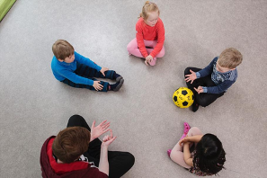 Sett dere i en sirkel på gulvet, slik at barna kan kaste eller trille ballen til hverandre. Lag en regel om at barna må ta imot ballen med begge hender.