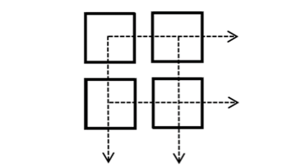 Begynn med et 2 x 2-rutenett på tavla, og be elevene tegne det i boka.