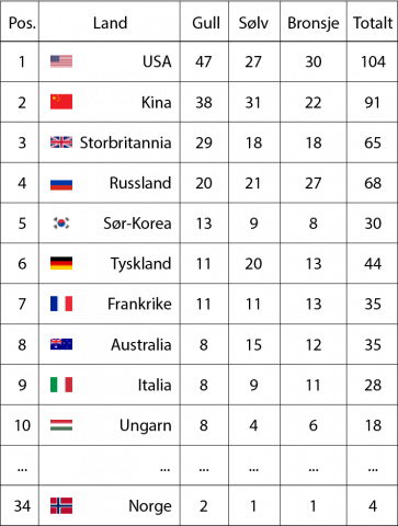 Her ser du de topp 10 medaljevinnende nasjonene i de olympiske sommerlekene i 2012: