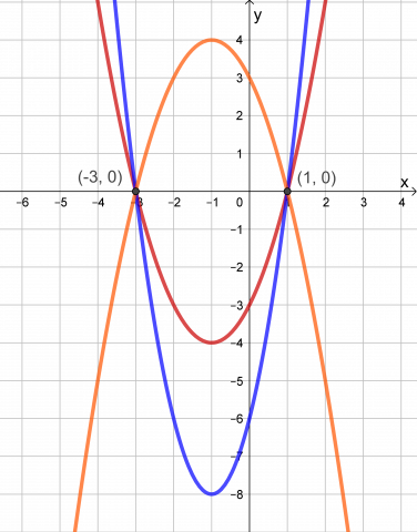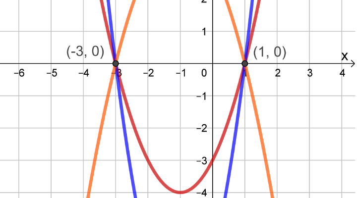 d.  Alle funksjoner som har de samme to parentesene som faktorer har de samme nullpunktene. Vi kan lage uendelig mange slike funksjonsuttrykk ved å føye til en tallfaktor, positiv eller negativ (men ikke 0). For hver nye tallfaktor forandres grafens form, men nullpunktene er de samme.