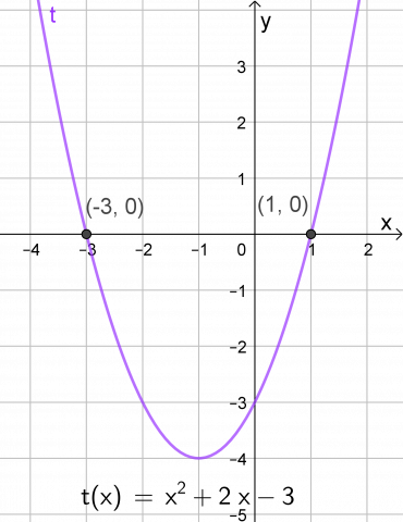 Vi kan skrive funksjonen på faktorisert form, \(t(x)=(x+3)(x-1)\)\(x=-3\) og \(x=1\) er nullpunkter, for det er disse to x-verdiene som gjør funksjonen lik 0.