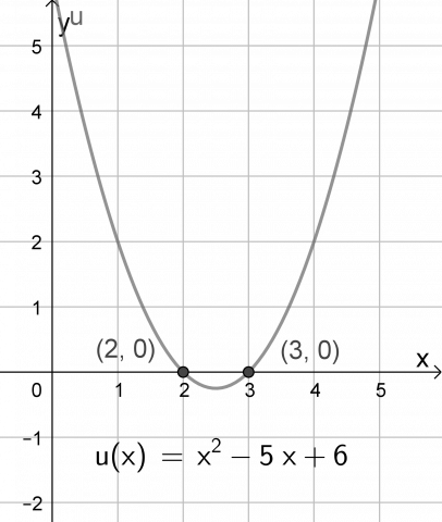 Vi kan skrive funksjonen som \(u(x)=(x-2)(x-3)\). Det er \(x=2\) og \(x=3\) som gjør denne funksjonen lik 0, så dette er funksjonens nullpunkter.