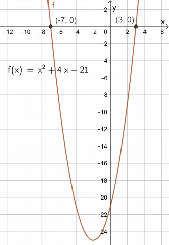 \(f(x)=(x-3)(x+7)=x^2+(-3+7)x+(-3) \cdot 7= x^2+4x-21\)