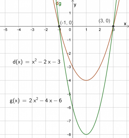 c.  \(d(x)=x^2-2x-3=(x+3)(x-1)\) og \(g(x)=2(x^2-2x-3)= 2(x+3)(x-1)\). Funksjonene inneholder de samme faktorene (parentesene) som inneholder x, men i tillegg har faktoren 2.