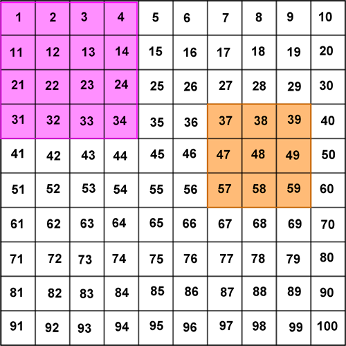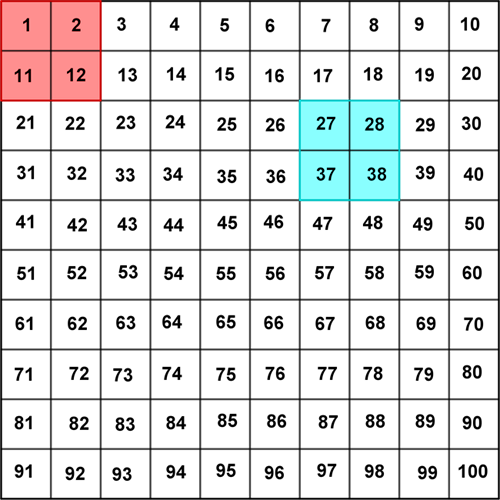 Be elevene fortsette med å markere rutene 27, 28, 37, 38 og regne ut på tilsvarende måte her. Hva blir svaret nå? Er det noen som tror de kan finne flere steder i hundrekartet hvor de vil få samme svar? La dem prøve en stund (bare med 2 x 2-ruter). Når alle har fått tid til flere forsøk, er det tid for å diskutere i fellesskap: Vil det bli samme svar uansett hvor vi plasserer kvadratet?