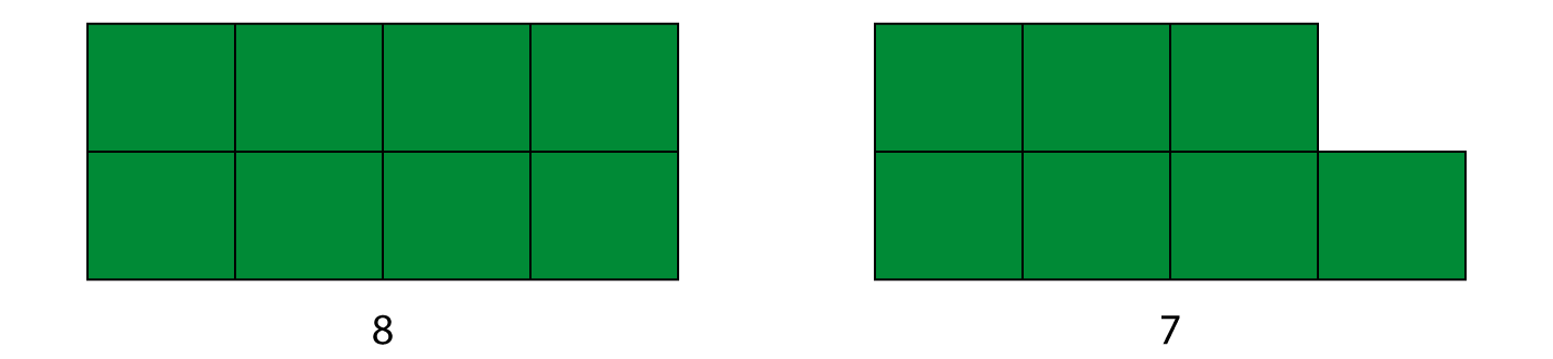 9 er et oddetall. Kan dere se det ut fra formen på blokken? 8 er et partall. Blokken for 8 er annerledes enn blokken for 9. Hva er forskjellen?