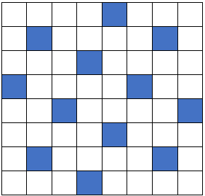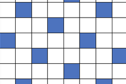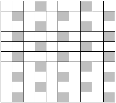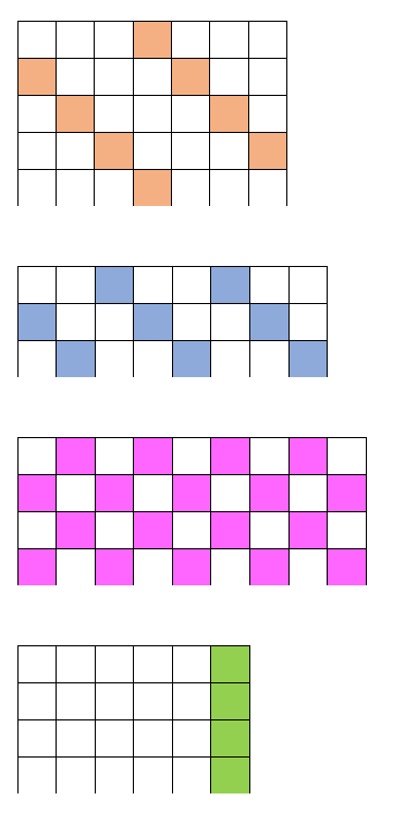 - I det siste mønsteret fargelegges hver tredje rute. Det betyr at tallet som lager mønsteret, må være 3. Mønsteret blir forskjøvet én rute mot høyre for hver rad. Vi får til å tegne mønsteret i et åtter-kart. Kartet kan også utvides med 3, eller med multipler av 3. Mønsteret kan derfor tegnes i 8-kart, 11-kart, 14-kart, 17-kart, 20-kart, 23-kart osv.
