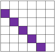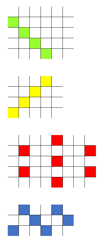- Det andre mønsteret lager en diagonal som går andre veien. Derfor tror vi at tallet som lager dette mønsteret, er én mindre enn kartstørrelsen. Da kan kartet være et femmer-kart, og tallet som lager mønsteret, kan være 4.