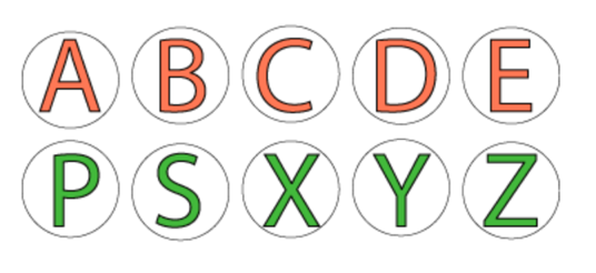 Bokstavene ved (0,2) og (1,2) ligger i hver sin ende av det engelske alfabetet.