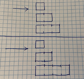 Camilla putter en plankebit inn i matematikkmaskinen. Det kommer da ut to plankebiter som ikke er like store. Det er den samme plankebiten som kommer ut, pluss en til som er like bred og høy, men dobbelt så lang. For hver gang de putter inn plankene, får de ut de samme som de puttet inn pluss en ny som er like bred og høy som de andre, men dobbelt som lang som den forrige.