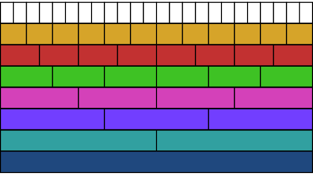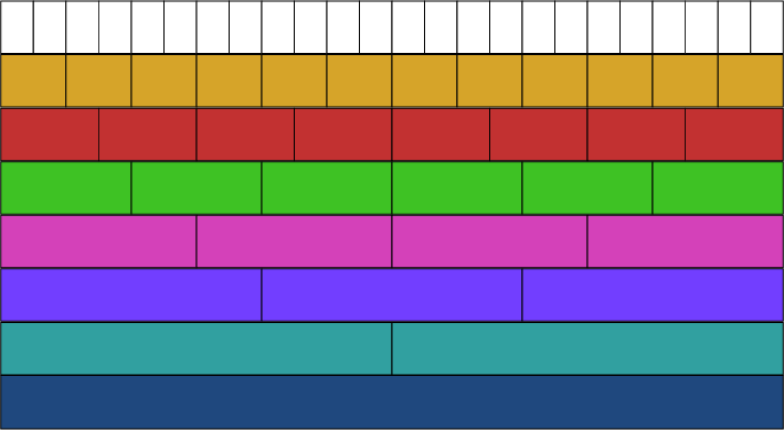 Introduser aktiviteten ved å presentere brøkveggen for klassen. Spør elevene hva de ser, og be dem dele observasjonene sine med en medelev. Elevene deler deretter ideene i plenum. Læreren kan styre samtalen mot brøk dersom elevene ikke naturlig kommer inn på det. Still åpne spørsmål om brøkene som er representert av de ulike stavene i bildet, og bruk den lilla staven som «helhet». Oppdager elevene noen brøker som er likeverdige? Spørsmål som «Hvor mange kvarte er det samme som en halv?» kan oppmuntre barn til å sette stavene sammen for å lage brøker som tjuefiredeler, i stedet for å se bare på enhetsbrøkene representert av individuelle staver.