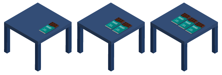 Elevene kan utforske videre: fire bord med 1, 2, 3 og 4 sjokoladeplater. De kan sammenligne aktivitetene, lete etter likheter og forskjeller og begrunne argumentene sine.
