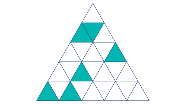Hvis den stiplete linjen er symmetrilinjen, kan man få symmetri ved å farge tre trekanter til. De to andre mulige symmetrilinjene krever at 5 eller 6 trekanter farges.
