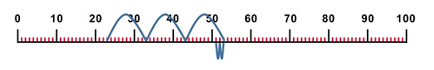 Jeg kaster terningen og får en toer og så en treer. Starttallet mitt blir da 23. Jeg gjør følgende hopp for å komme så nær 50 som mulig: