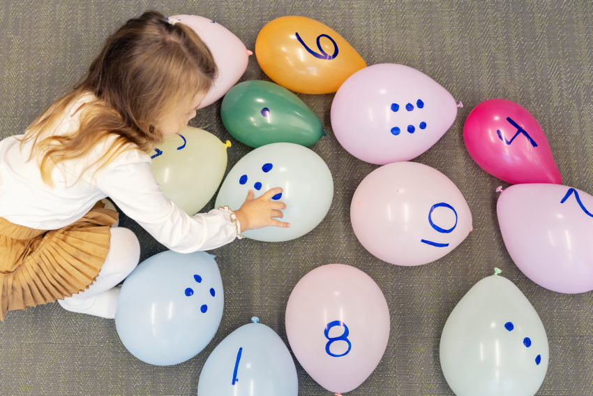 Til denne aktiviteten trenger du ballonger og tusjer. Bruk tusjen og skriv prikker eller tallsymboler på oppblåste ballonger. På første ballong skriver du for eksempel tallsymbolet 1, på den neste to prikker, på den neste tallsymbolet 3 osv. Involver barna mens du skriver prikkene og tallsymbolene. Du kan gjerne tilpasse slik at flere ballonger har samme antall prikker eller samme tallsymbol. Still spørsmål som: