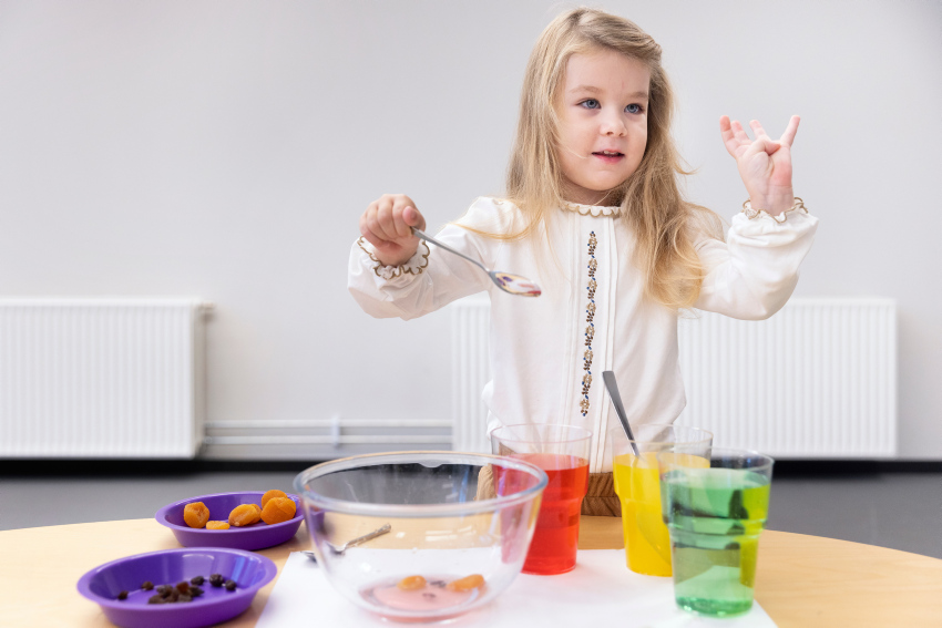 For å utfordre barnas tallforståelse ytterligere kan du late som du glemmer deler av oppskriften og barna må hjelpe deg å fylle ut manglende informasjon. For eksempel kan du si at det skal være tre små skjeer med gult, og så direkte etter at disse har kommet i skålen så kommer du på at det ikke var tre skjeer, men fem. Her må barna sammen finne ut hvordan de kan løse dette.