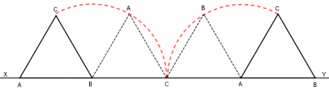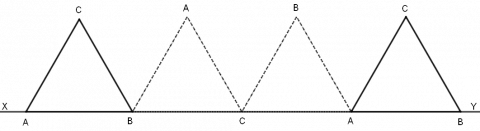 Trekanten blir rotert med klokka om punktet B, heilt til BC ligg på XY. Så blir han rotert på same måte om C, og til slutt blir han rotert om A, slik figuren viser.